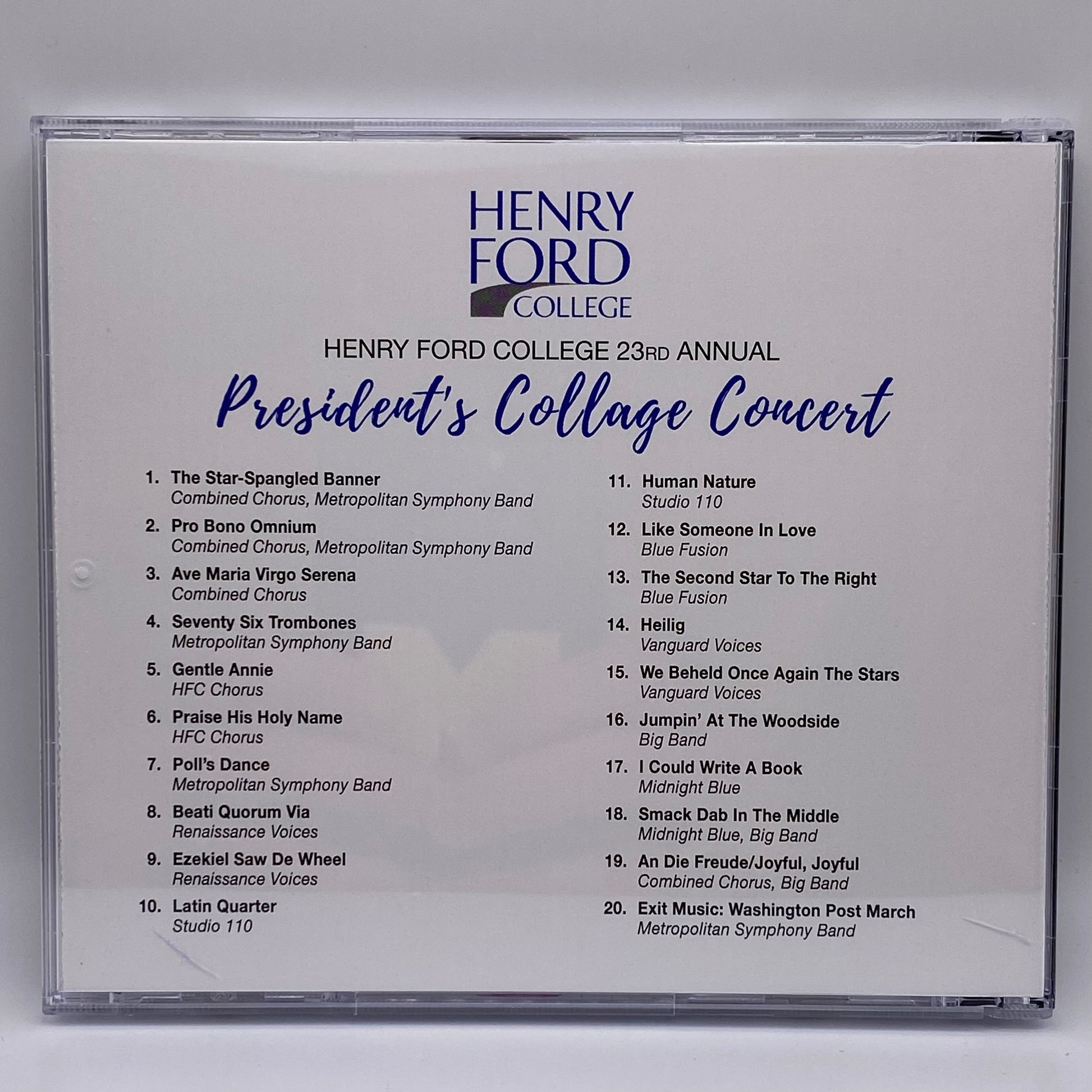 If you want to sample all the styles of music performed at the college, this disc is for you. Classical symphony and choir, vocal jazz, and of course the Henry Ford Big Band all have tracks on this album.